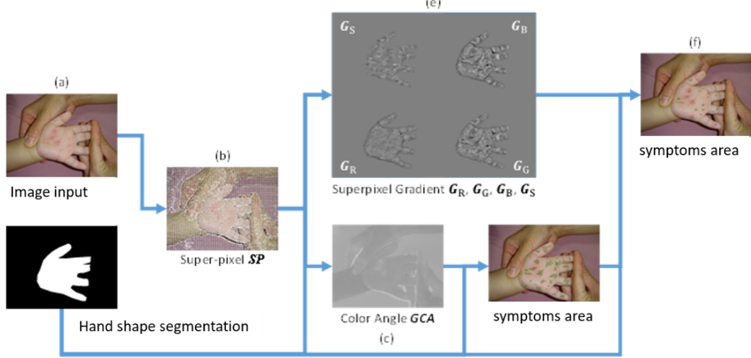 An artificial intelligence algorithm that automatically detects enterovirus symptoms. After taking an image of a child's hand, the algorithm analyzes and compares whether the child's hand has enterovirus symptoms. If the algorithm detects enterovirus symptoms on the hands of a child, a warning will be issued to remind the child that there is a possibility of enterovirus infection, so that the teacher can deal with it early and reduce the risk of transmission to other children.